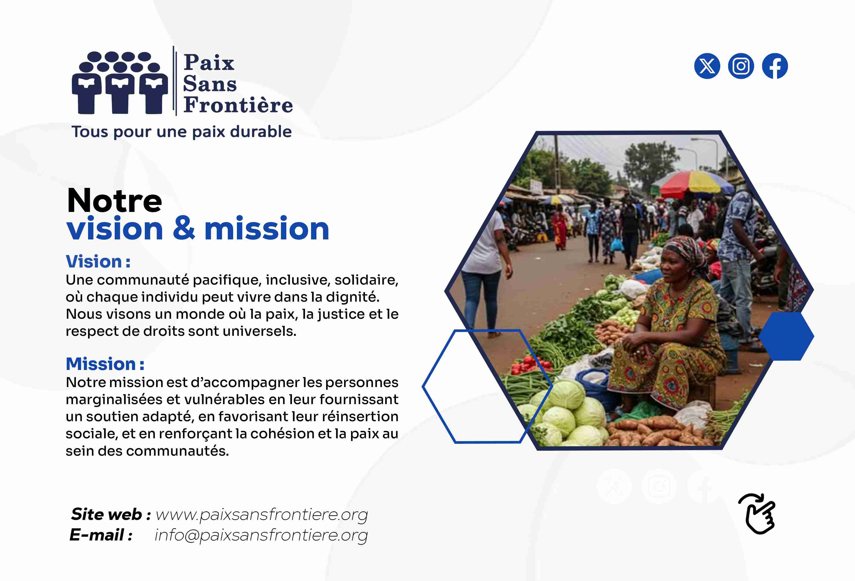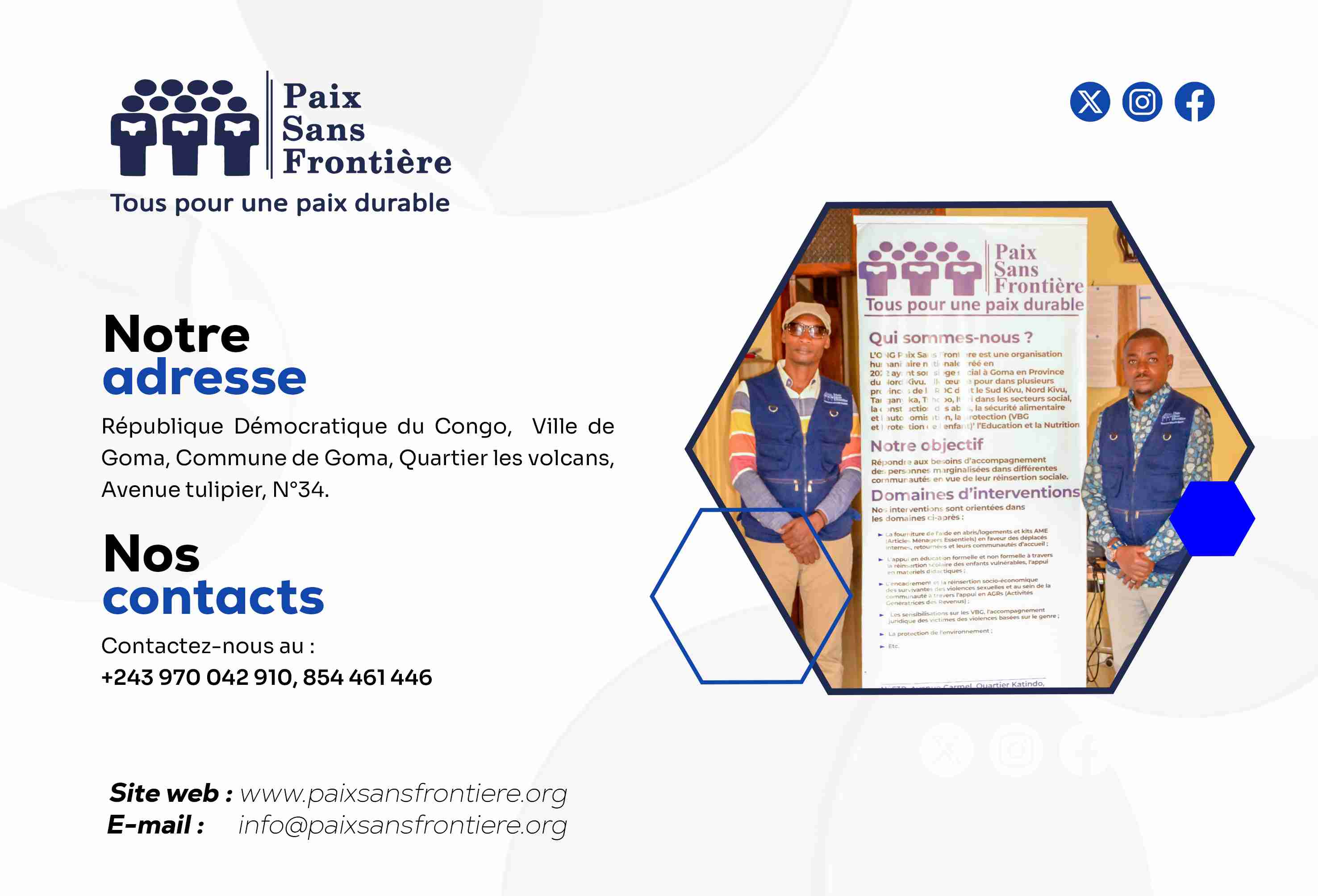 Paix Sans Frontière, PSF, dont le siège social est à Goma, est une Organisation non gouvernementale de droit congolais, strictement apolitique! Créée en 2022, Paix Sans Frontière dispose des documents légaux lui permettant de fonctionner sur toute l’étendue de la République Démocratique du Congo.